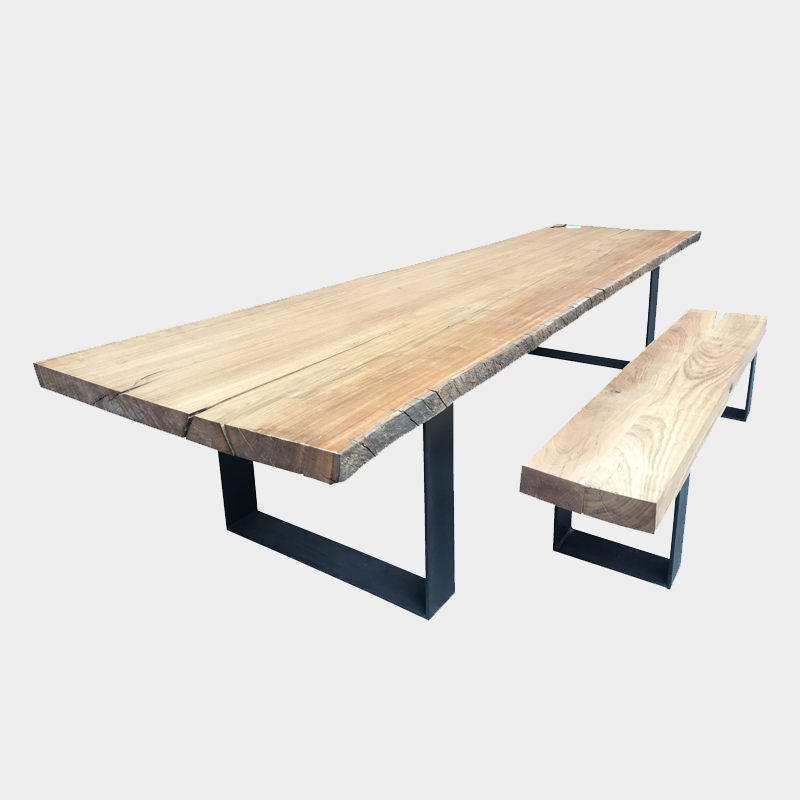 Beautiful thick live edge gumtree table and solid flat bar metal legs. Coupled with a matching bench.