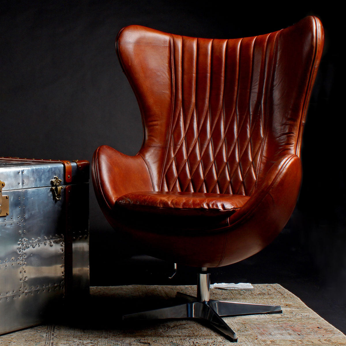 The Banshee Egg chair is upholstered in vintage Brazilian leather with diamond stitching oozes sophistication and luxury. This hand stitched chair is available in vintage Brazilian brown, black or rust colour leather.
