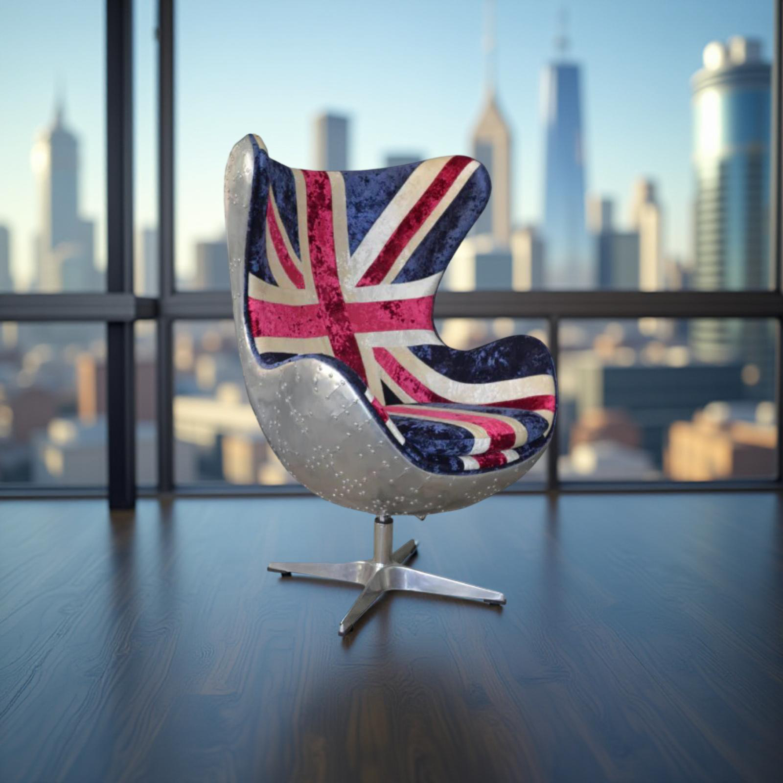 Our iconic shaped egg chair, with hand riveted aluminium is available in this fantastic flare of style and colour by making use of the timeless Union Jack flag in an indulgent crushed velvet fabric. This piece really is in a league of its own for the discerning buyer who wishes to set themselves apart from the rest. It features an adjustment lever in order to adjust the tilt of the chair.