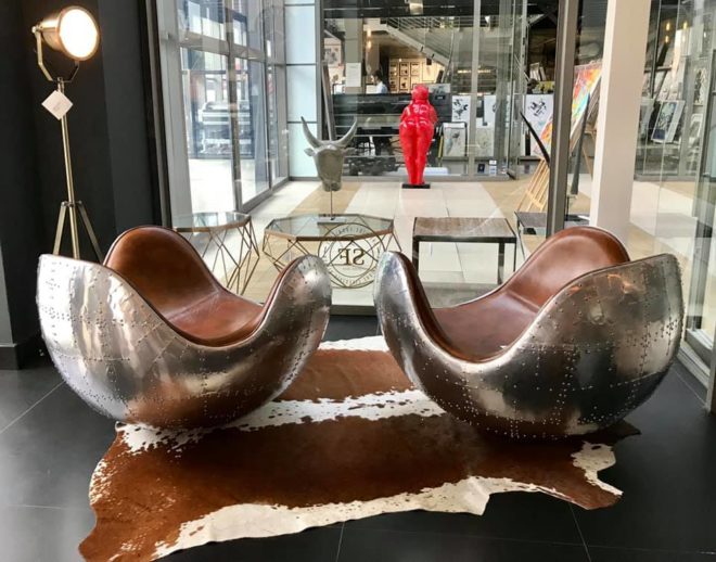 These custom made chairs are truly unique featuring a rocker style shape enabling you to relax and unwind. Featuring Aero-aluminium coupled with vintage style Brazilian leather upholstery for a truly luxurious feel.
