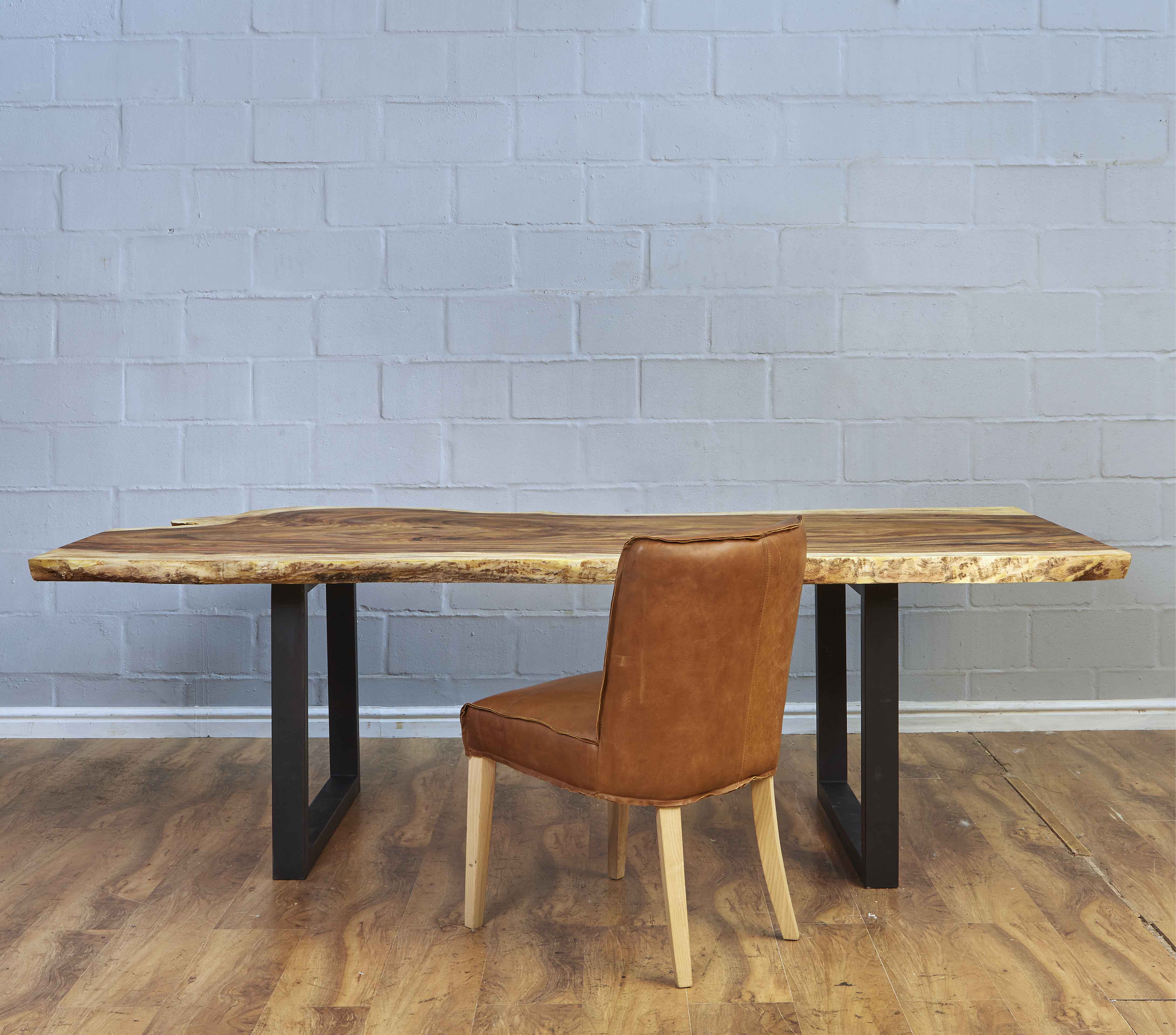 Handcrafted solid slab San Kiaat Dining Table with black metal legs. This is a locally sourced and manufactured dining table from our factory in cape Town with a thick live edge slab and flat bar legs. Thickness is approximately 8cm