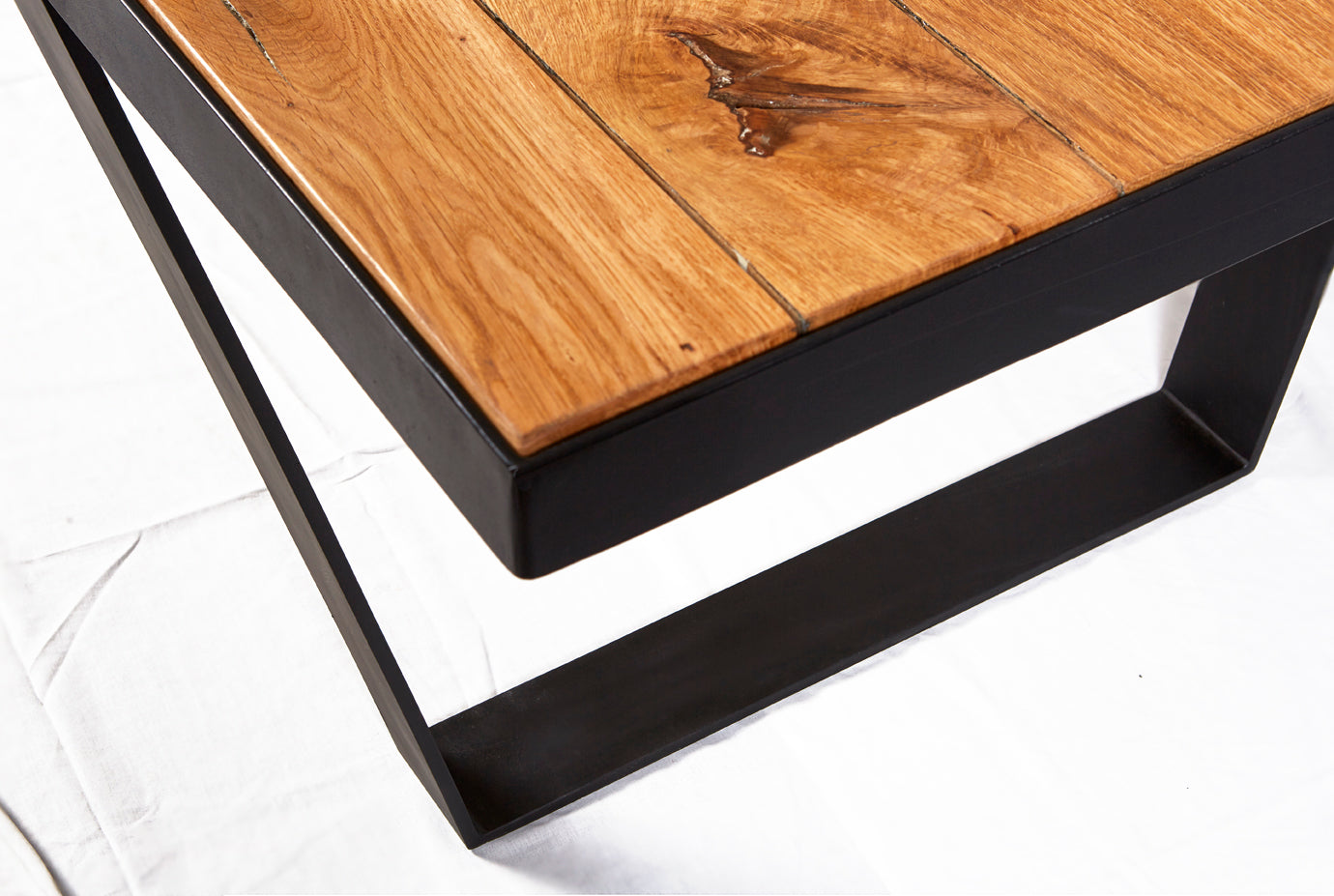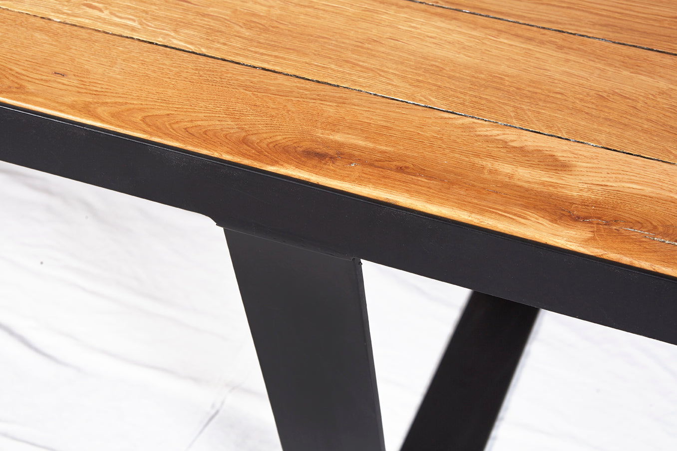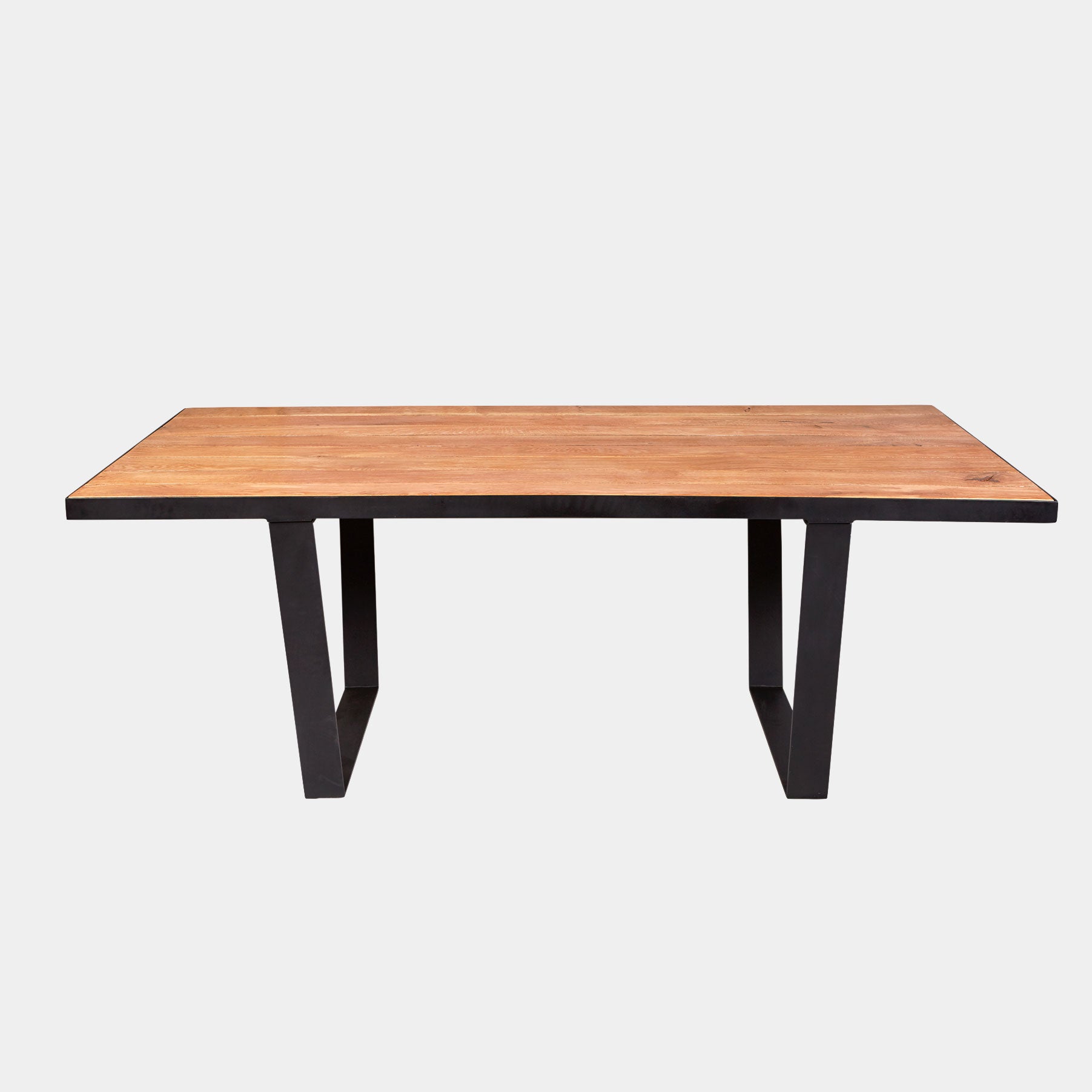 The Watou dining table features natural oak planks inserted into a flat bar metal frame and beautifully sealed for protection with a matt finish.