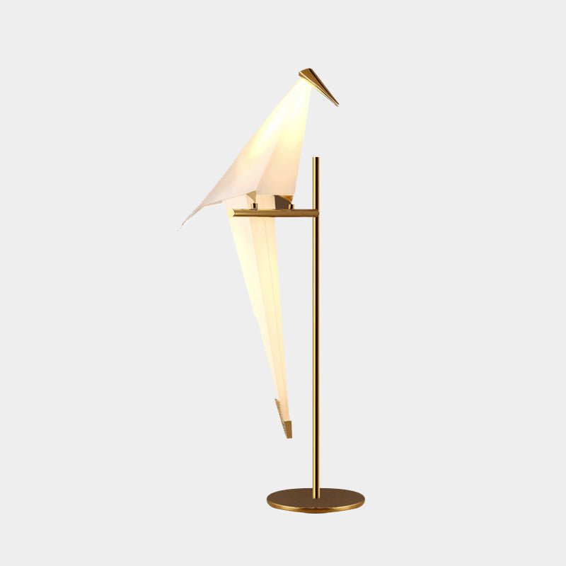 An iconic contemporary table lamp of an origami-style bird perched on a gold metal frame. The bird lights up via LED