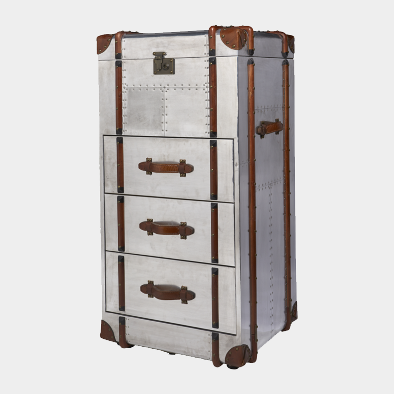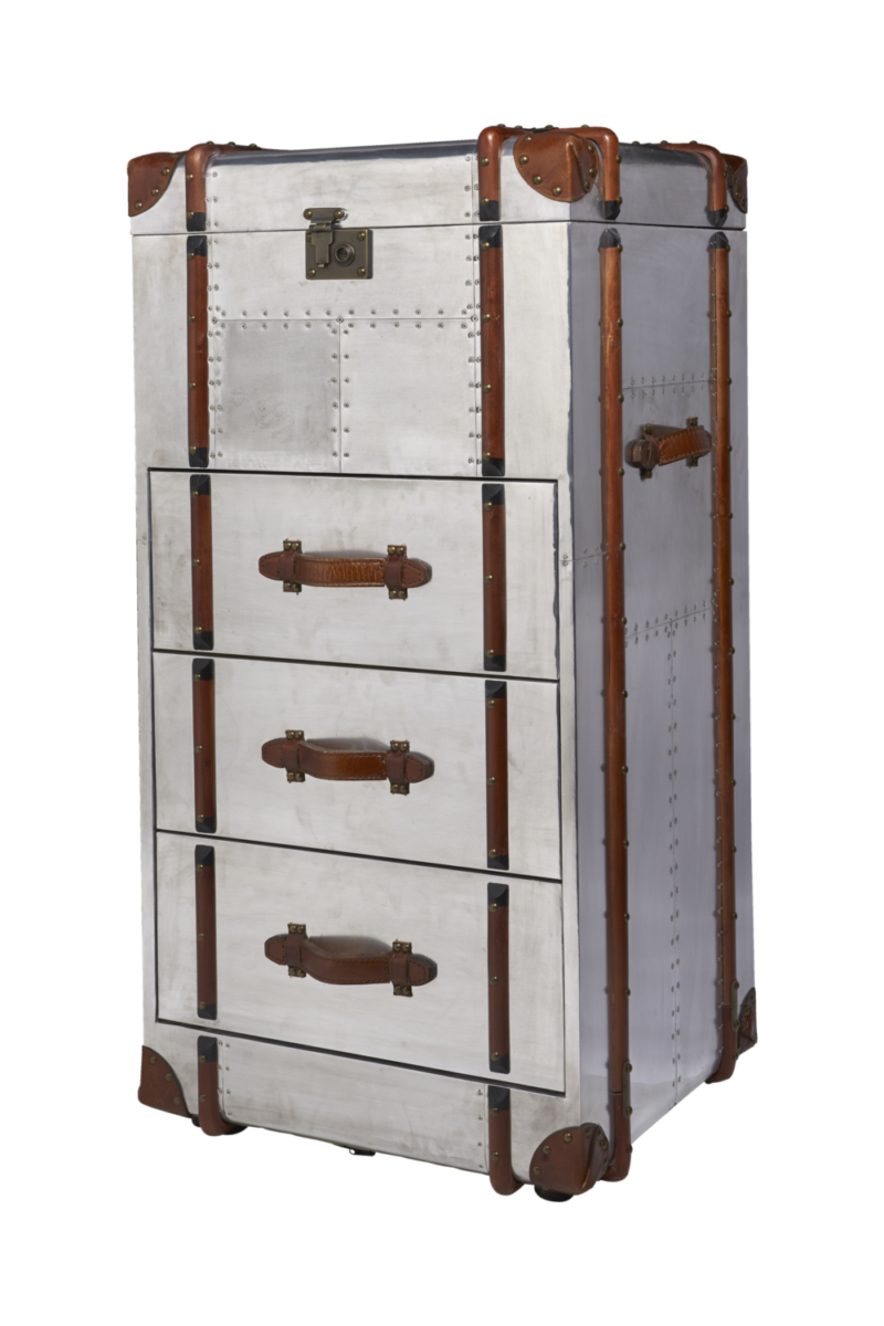 The sentry chest of Drawers is hand made using aero-aluminium, wood and leather creating a beautiful storage piece. The top also opens as a trunk for additional storage or as a drinks cabinet
