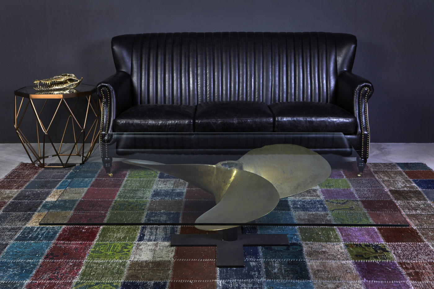Bronze Propeller Coffee Table made from an old brass/bronze boat propeller measuring approximately 70 - 100cm (depending on availability), fitted onto a metal stand with a 10mm tempered glass top approximately 100cm - 140cm in width depending on the size of the propeller. These are custom made and one of a kind coffee tables that define our style of infusing old and new designs to create beautiful yet functional furniture.