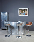 The Banshee bar Stool is an aviation style Bar stool featuring aero-aluminium panels with rivets beautifully upholstered in vintage style leather with a chrome base and foot rest. It is height adjustable and swivels
