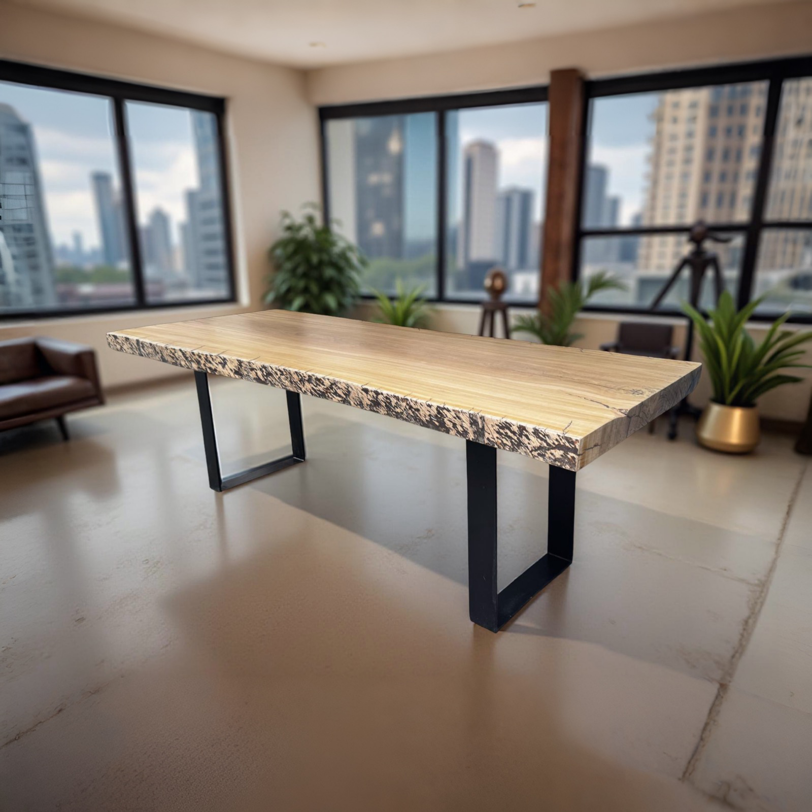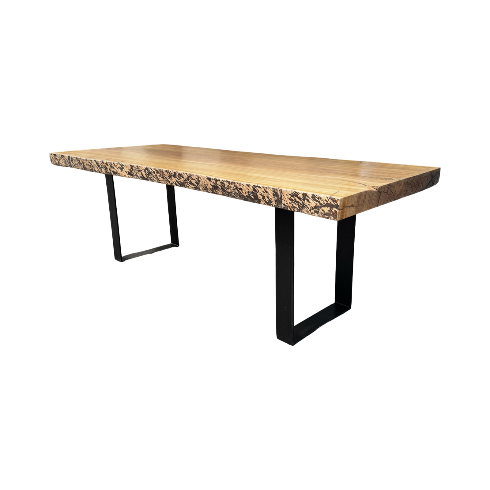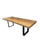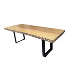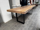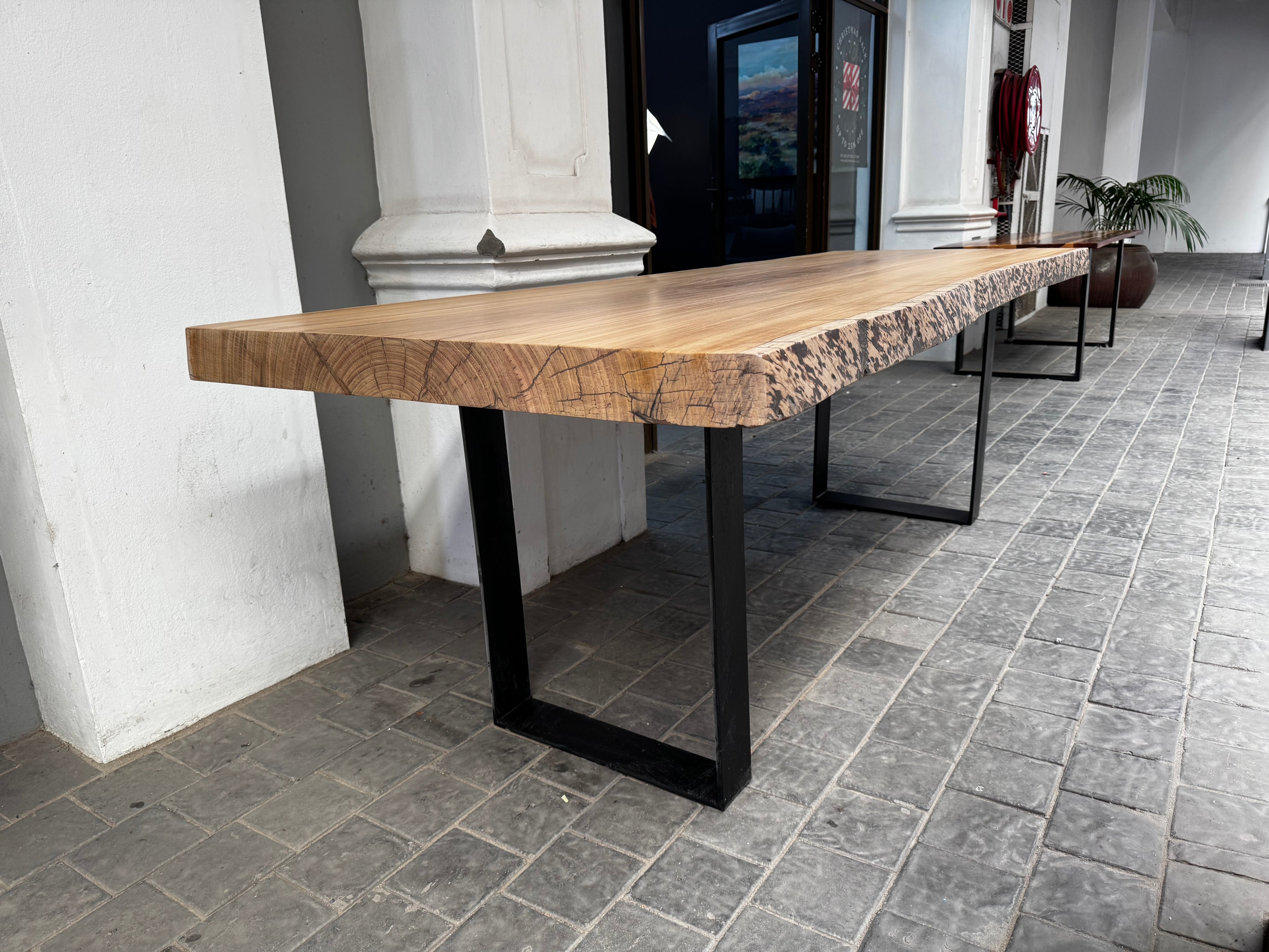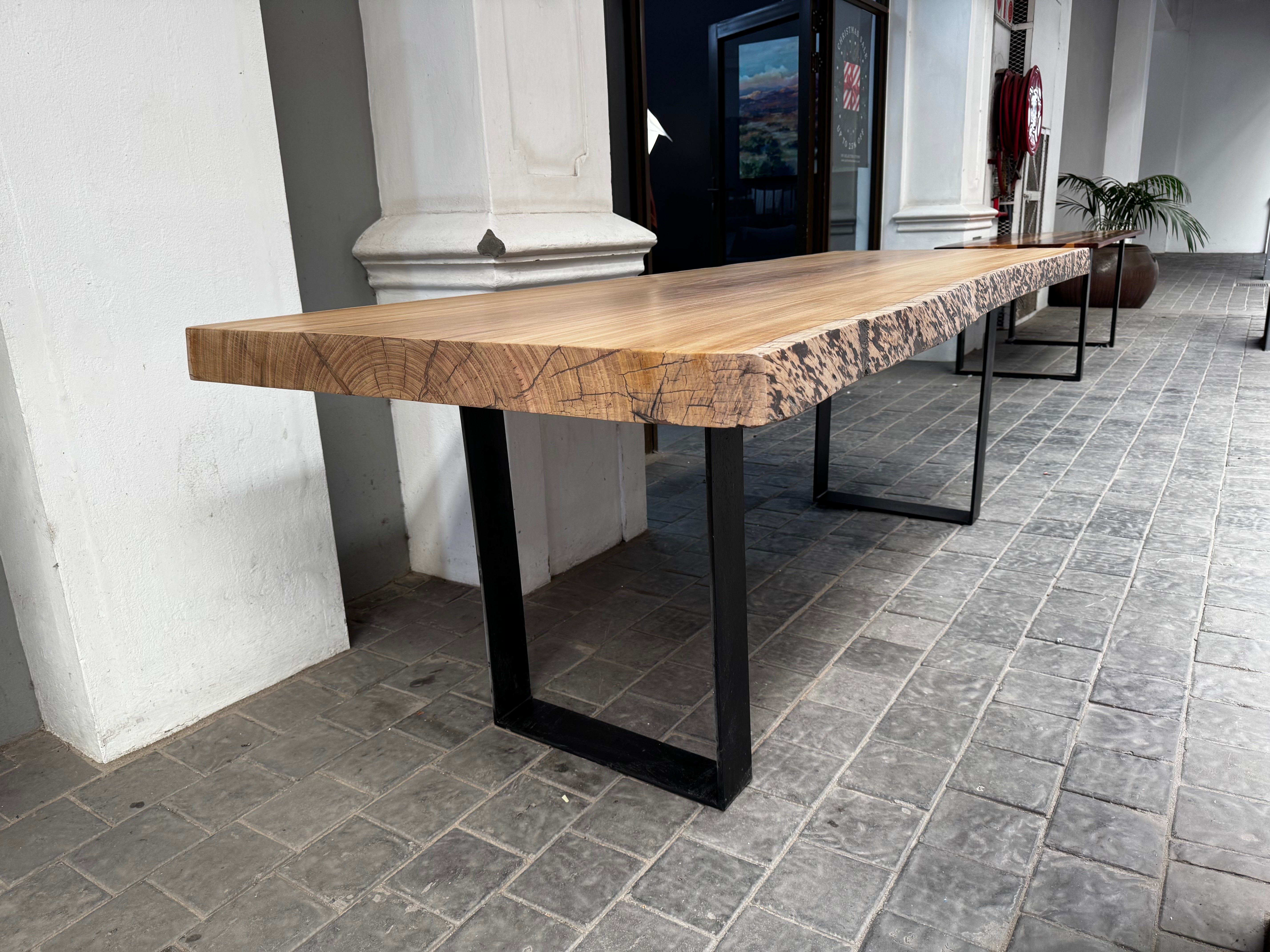 Beautiful thick live edge gumtree table and solid flat bar metal legs. Coupled with a matching bench.