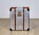 Handcrafted aero-aluminium, wood and leather steamer style trunk with solid brass latches. The lid opens for storage and inside is upholstered with canvas.