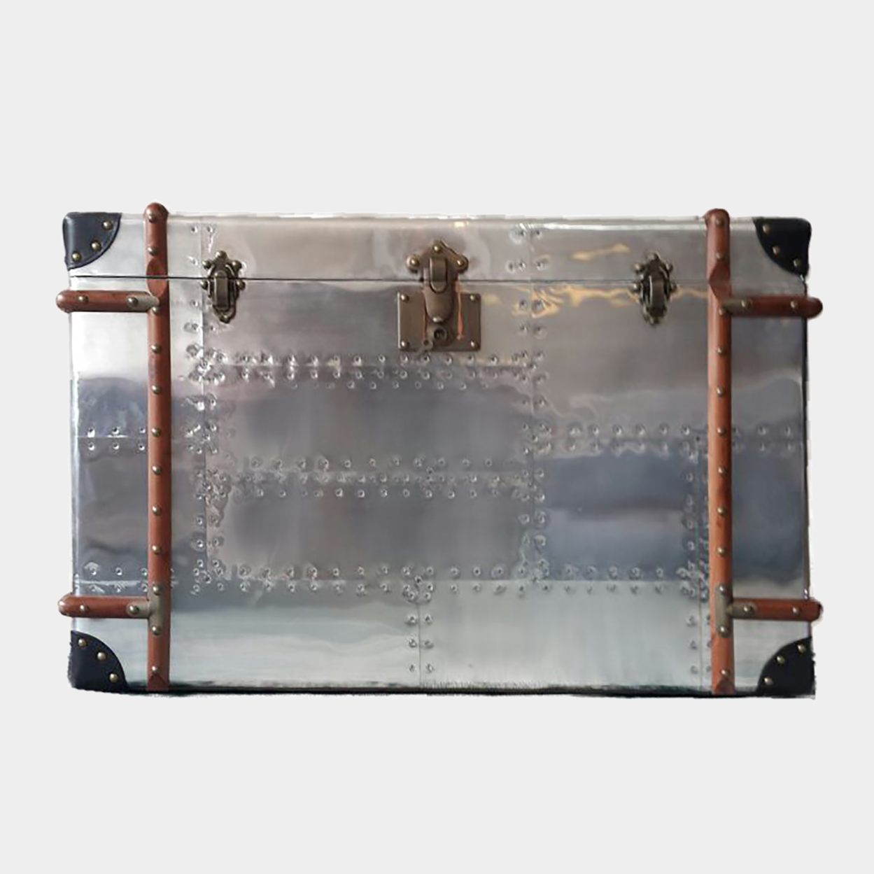 Handcrafted aero-aluminium, wood and leather steamer style trunk with brass latches.The lid opens for storage and is upholstered with canvas on the inside.