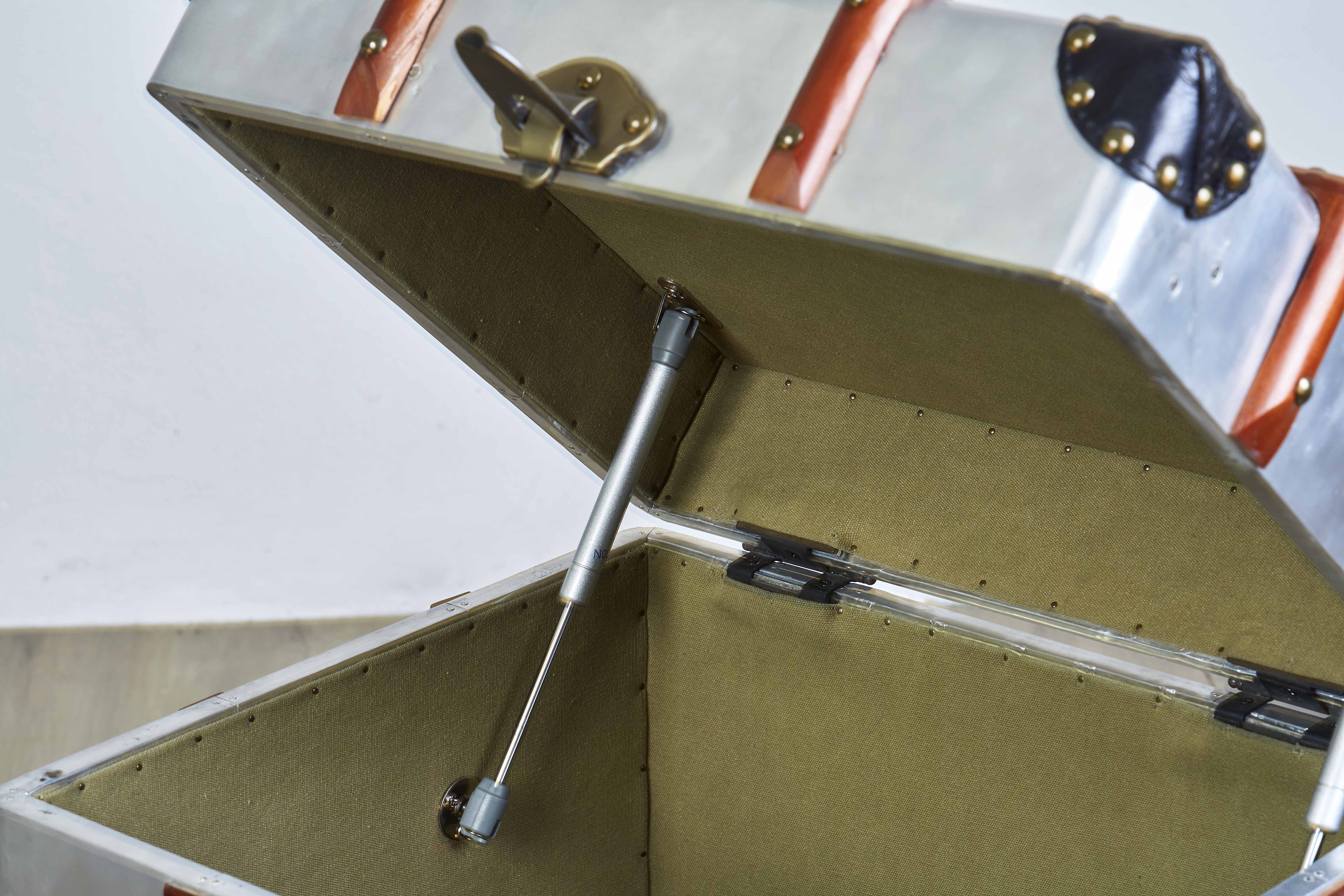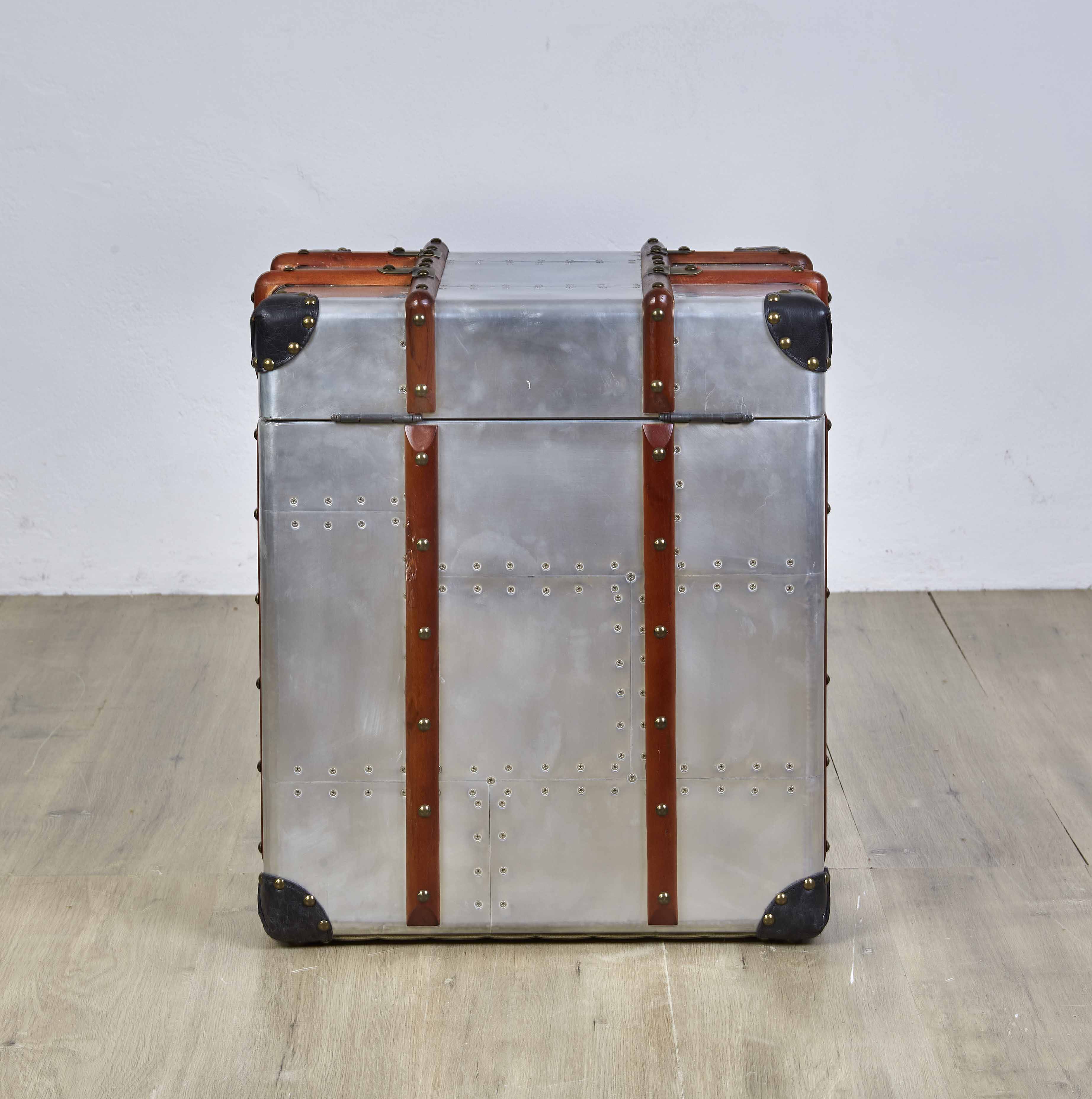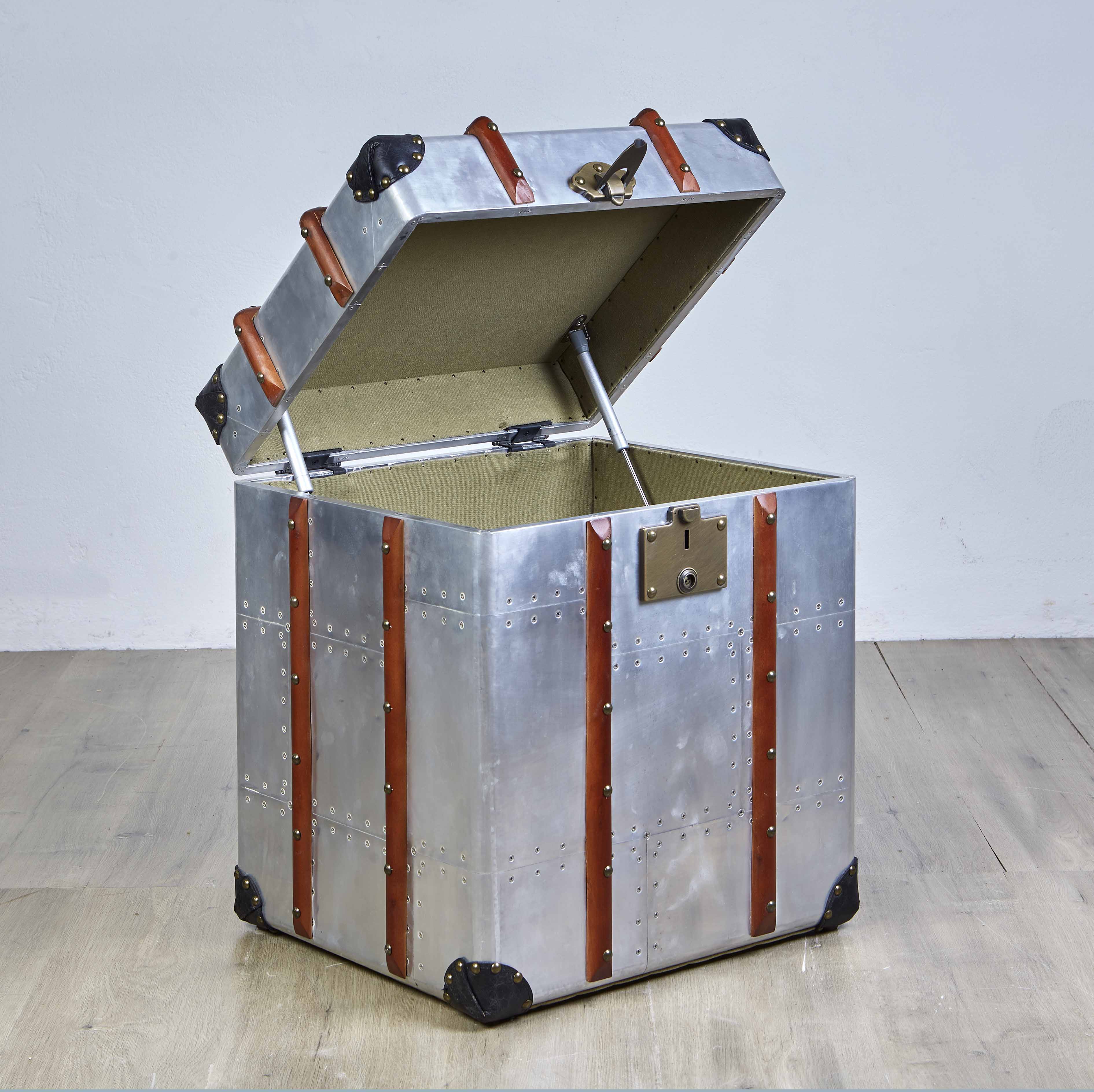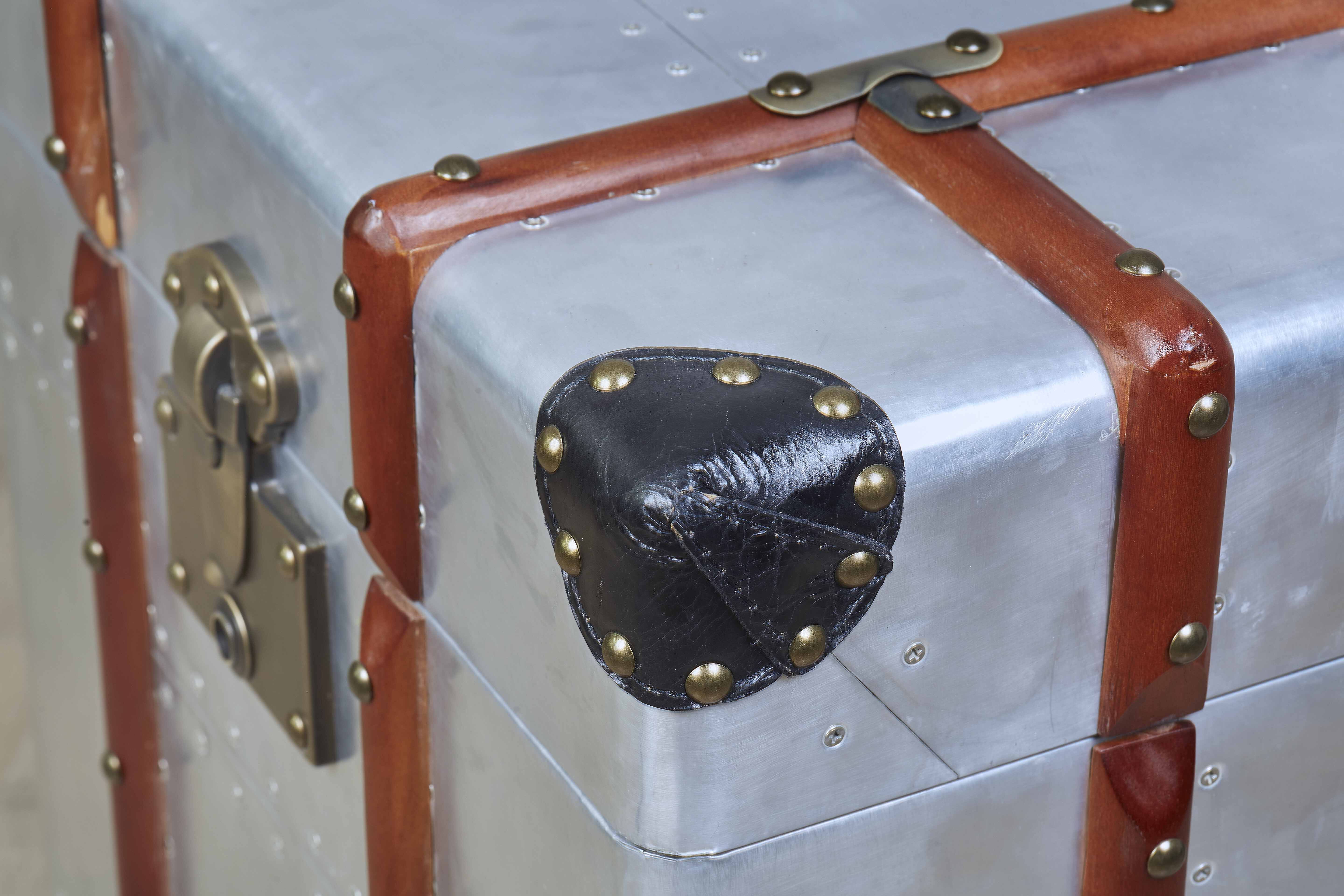Handcrafted aero-aluminium, wood and leather steamer style trunk with solid brass latches. The lid opens for storage and inside is upholstered with canvas.