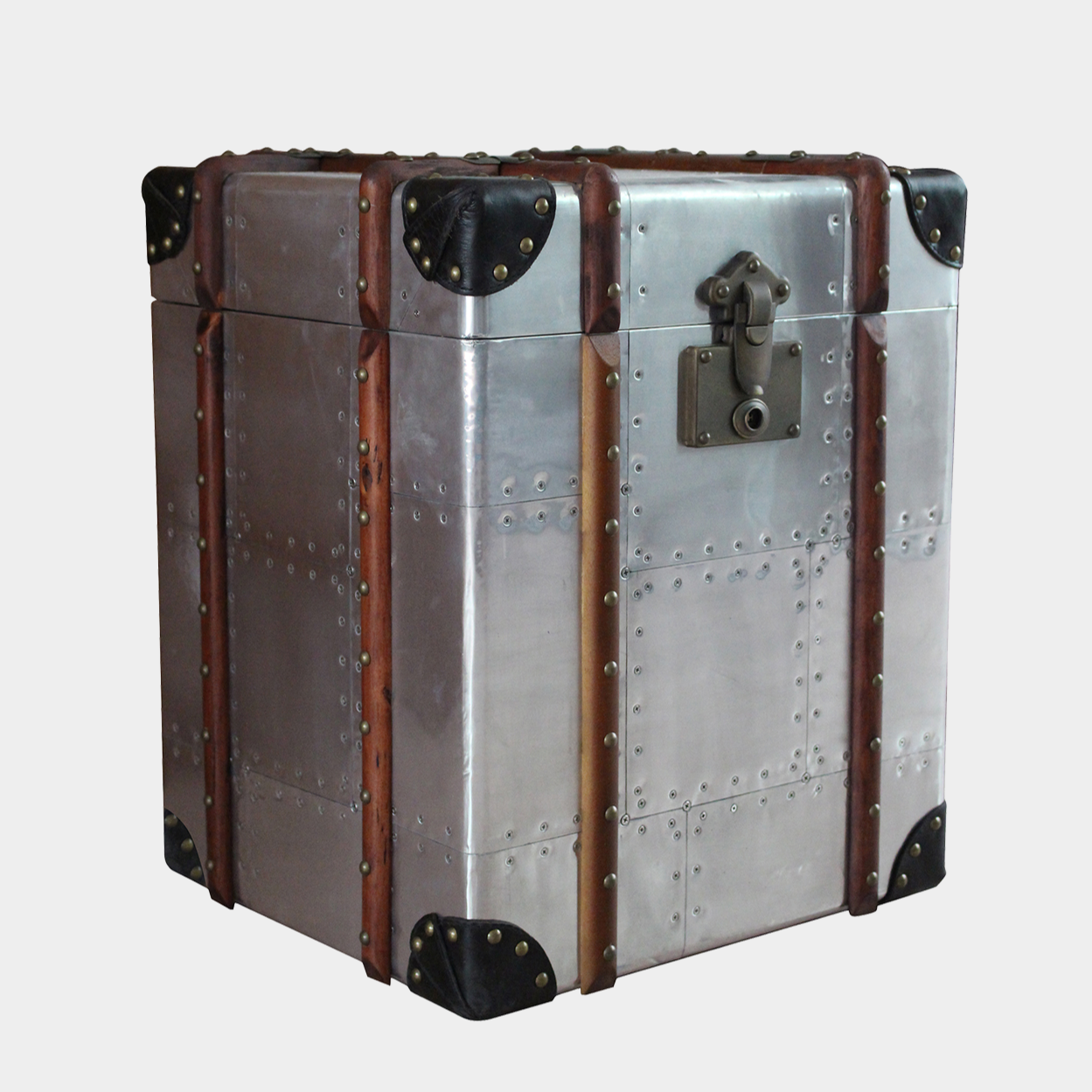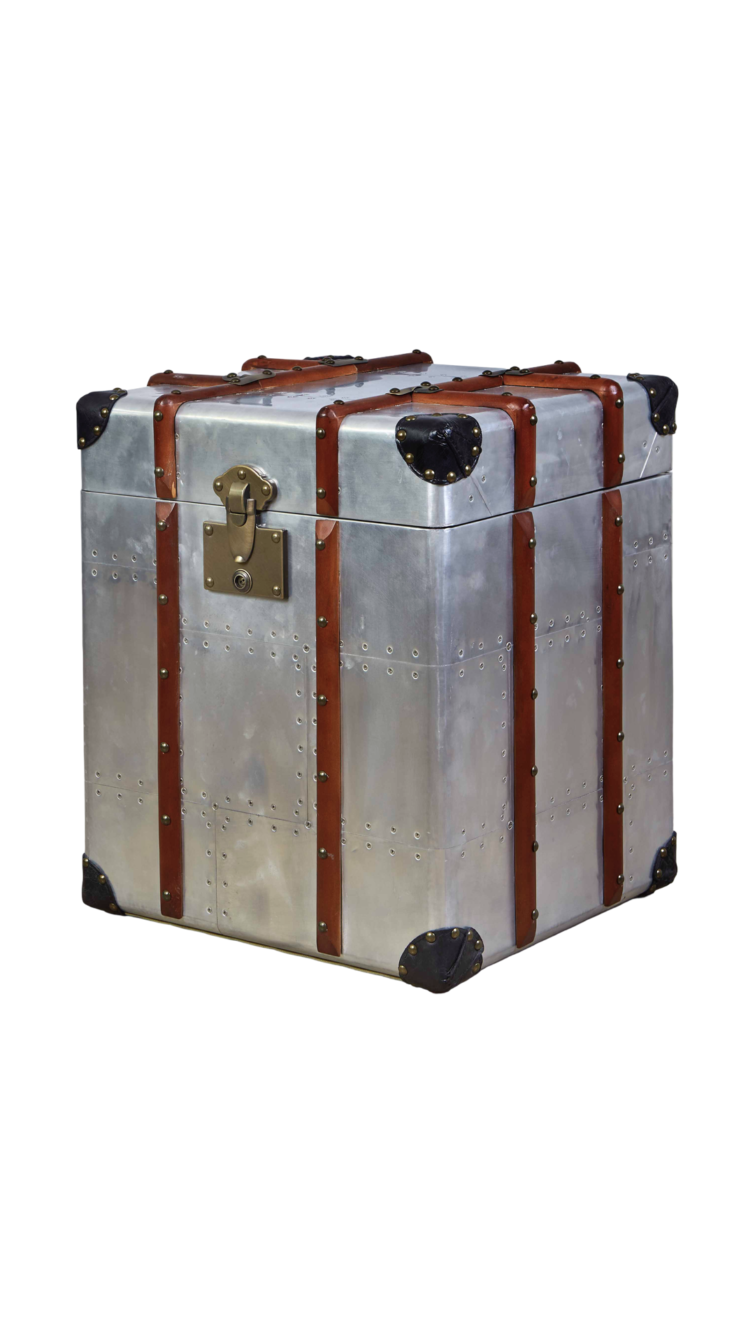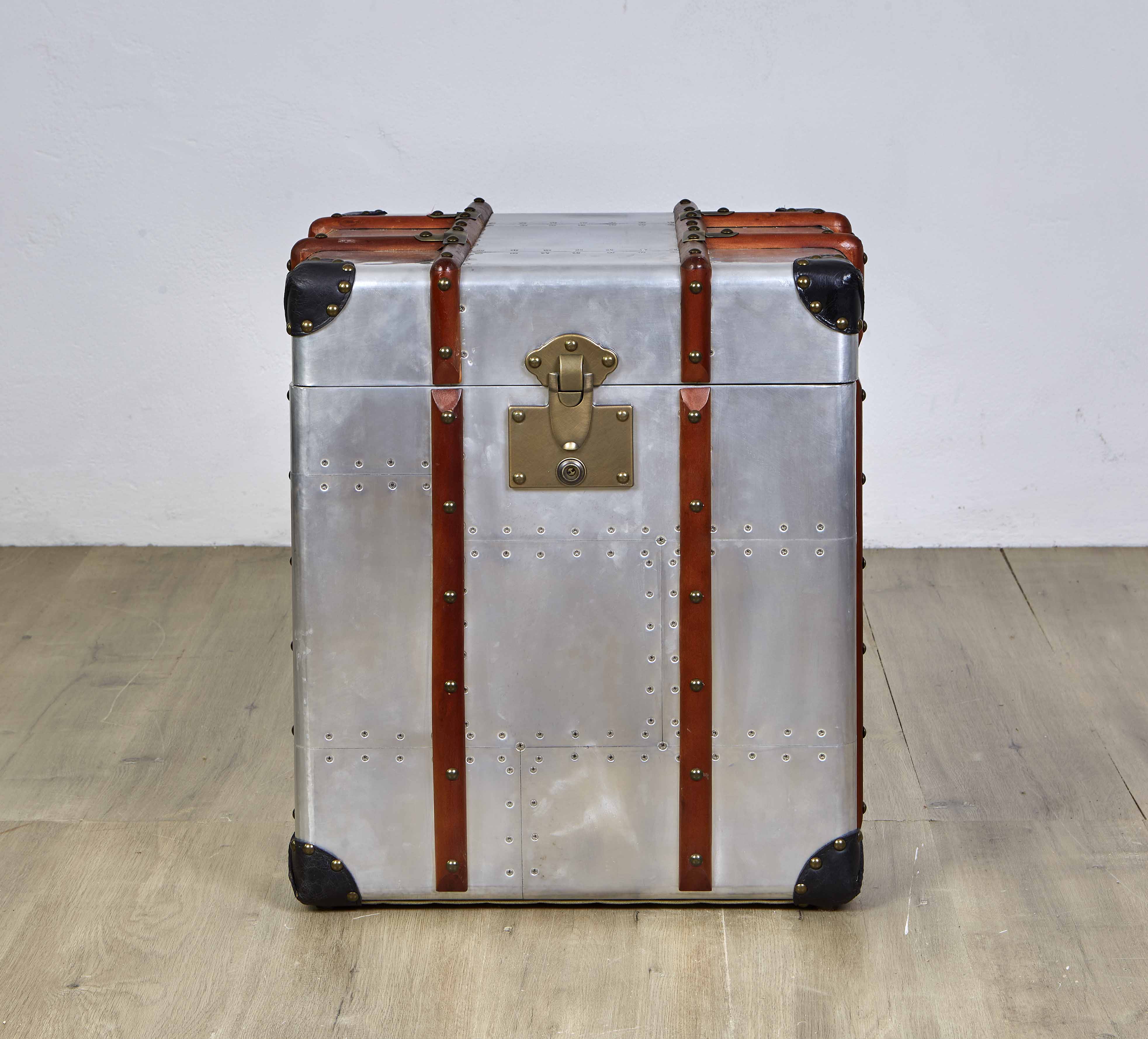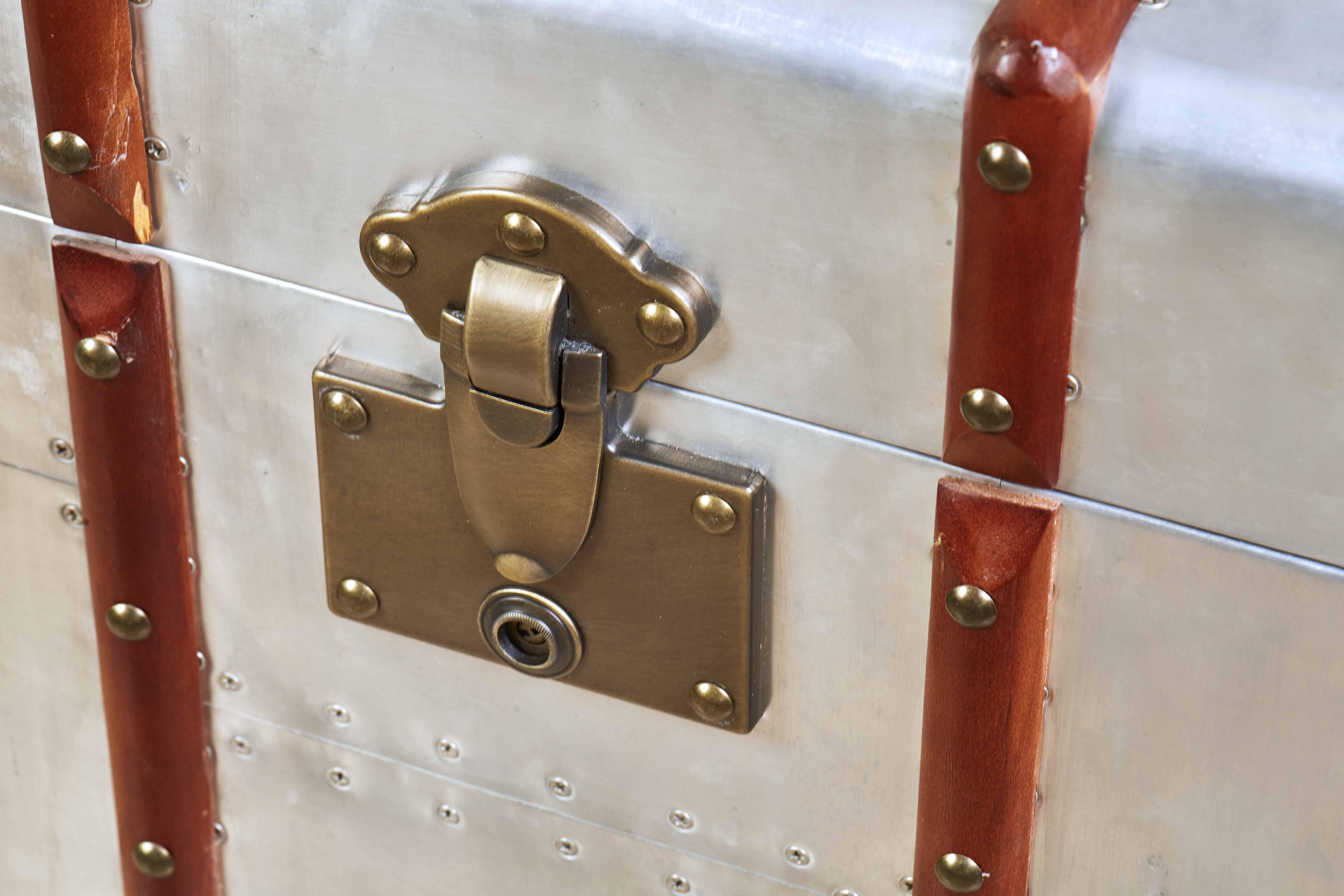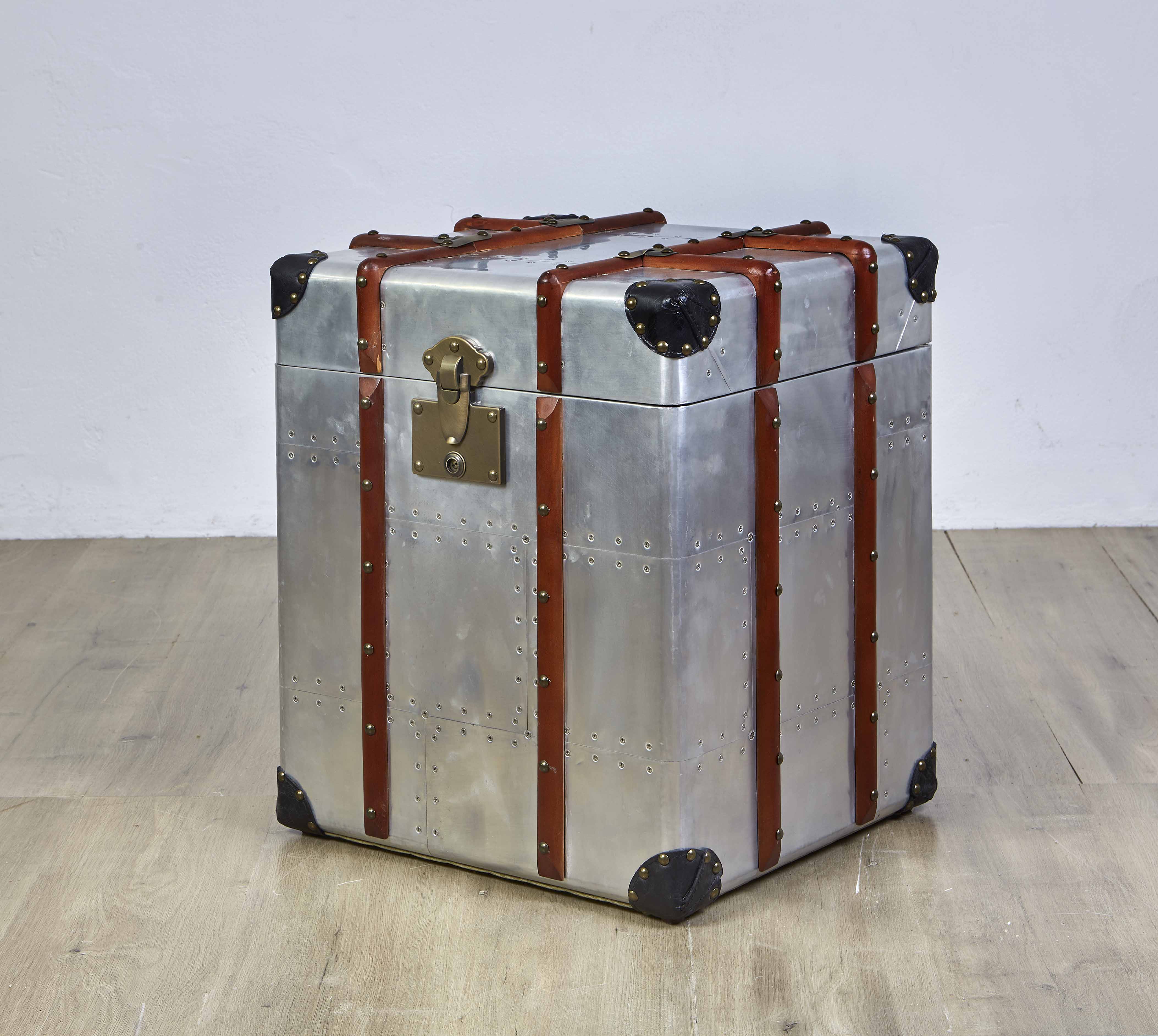 Handcrafted aero-aluminium, wood and leather steamer style trunk with solid brass latches. The lid opens for storage and inside is upholstered with canvas.