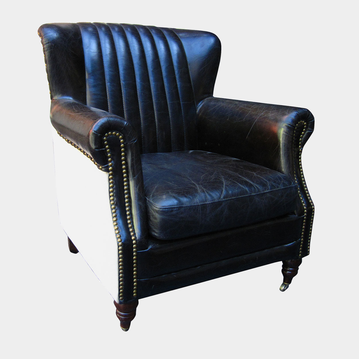 The Apache is a classic design armchair with beautiful curved arms, upholstered in full grain leather and ribbed back rest with cream fabric back and sides.