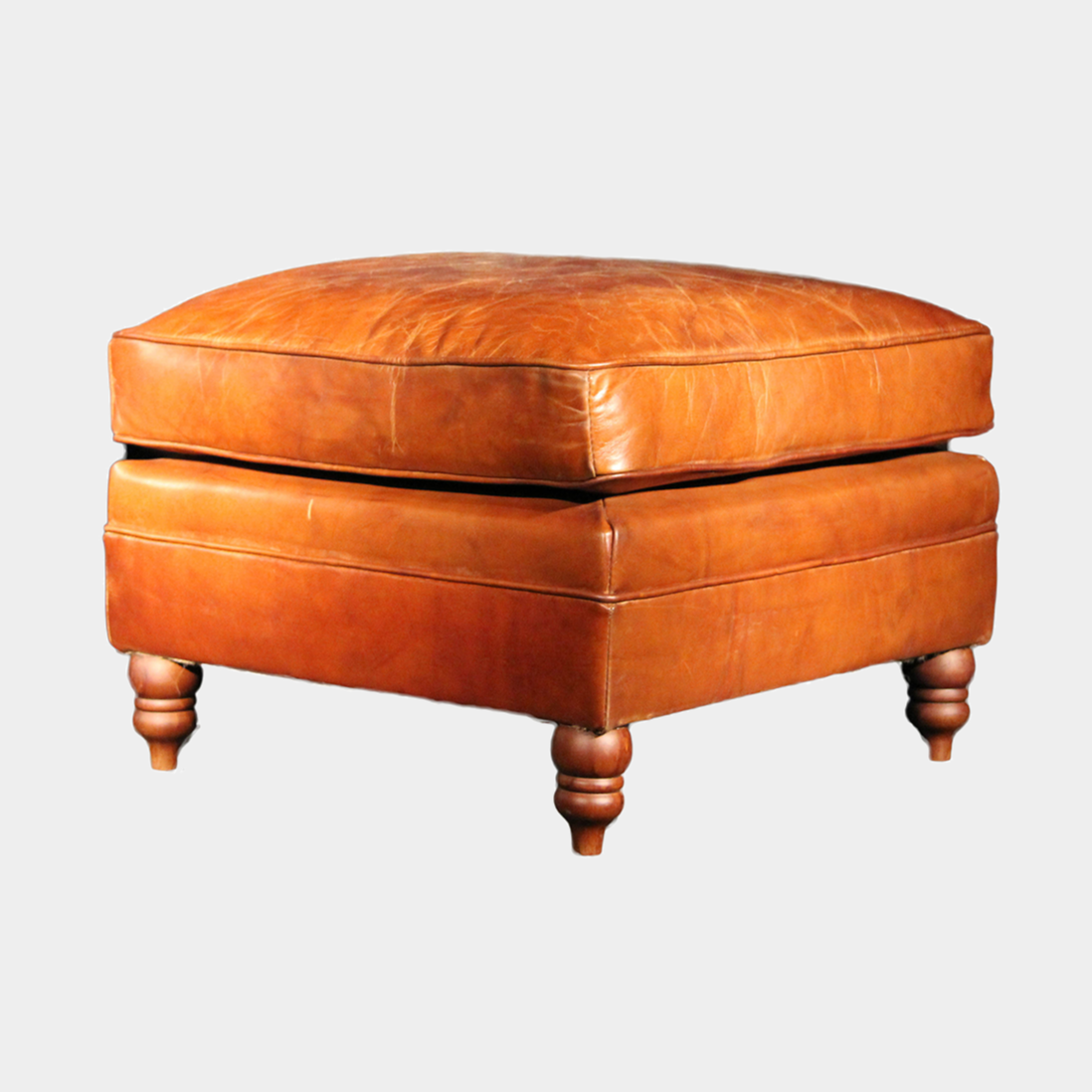 Laidback and effortless chic. The deep seating and generous cushioning of the Clipper Ottoman provides ample room for leg-stretching and lounging. Full-grain vintage leather with a side piping finish and curved wooden spool feet are the perfect ensemble for this dapper living room piece.