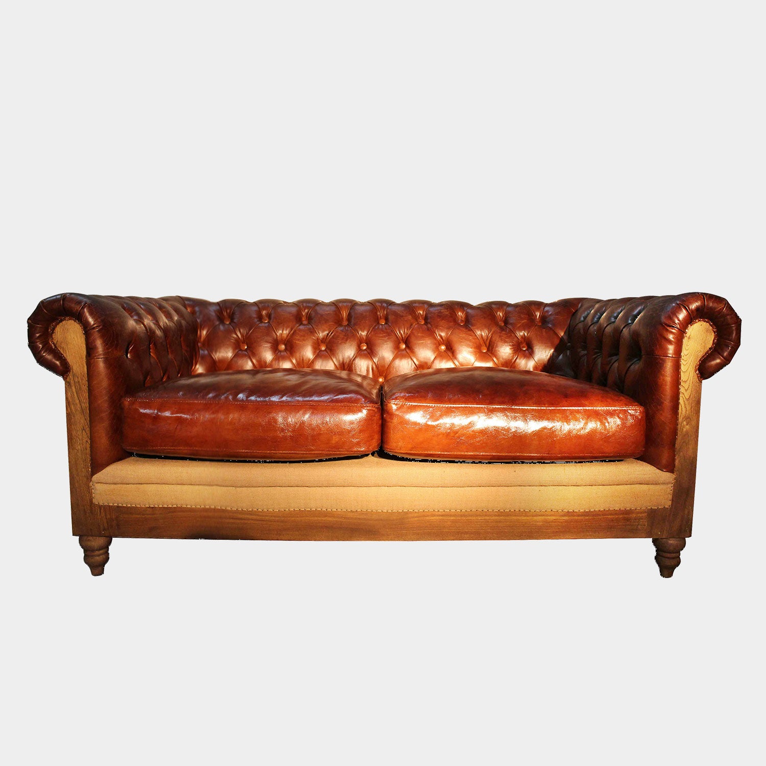 The Baron 2 Seater Sofa is a deconstructed, deep-buttoned design. Featuring an Ashwood exposed frame, the cushioning, back section and splendidly curved armrests are upholstered in sumptuous brown vintage leather. With side and front panels in cream canvas to complete its bold impression, this exquisite piece is bound to be a talking point wherever it is placed.