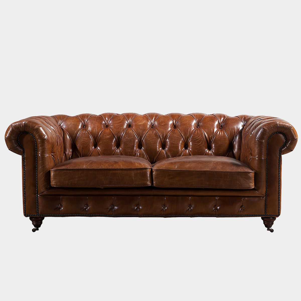 The iconic Chesterfield Sofa. This 2 Seater design is handmade to the highest standard in full grain leather, with luxurious deep-buttoning and brass stud detail.