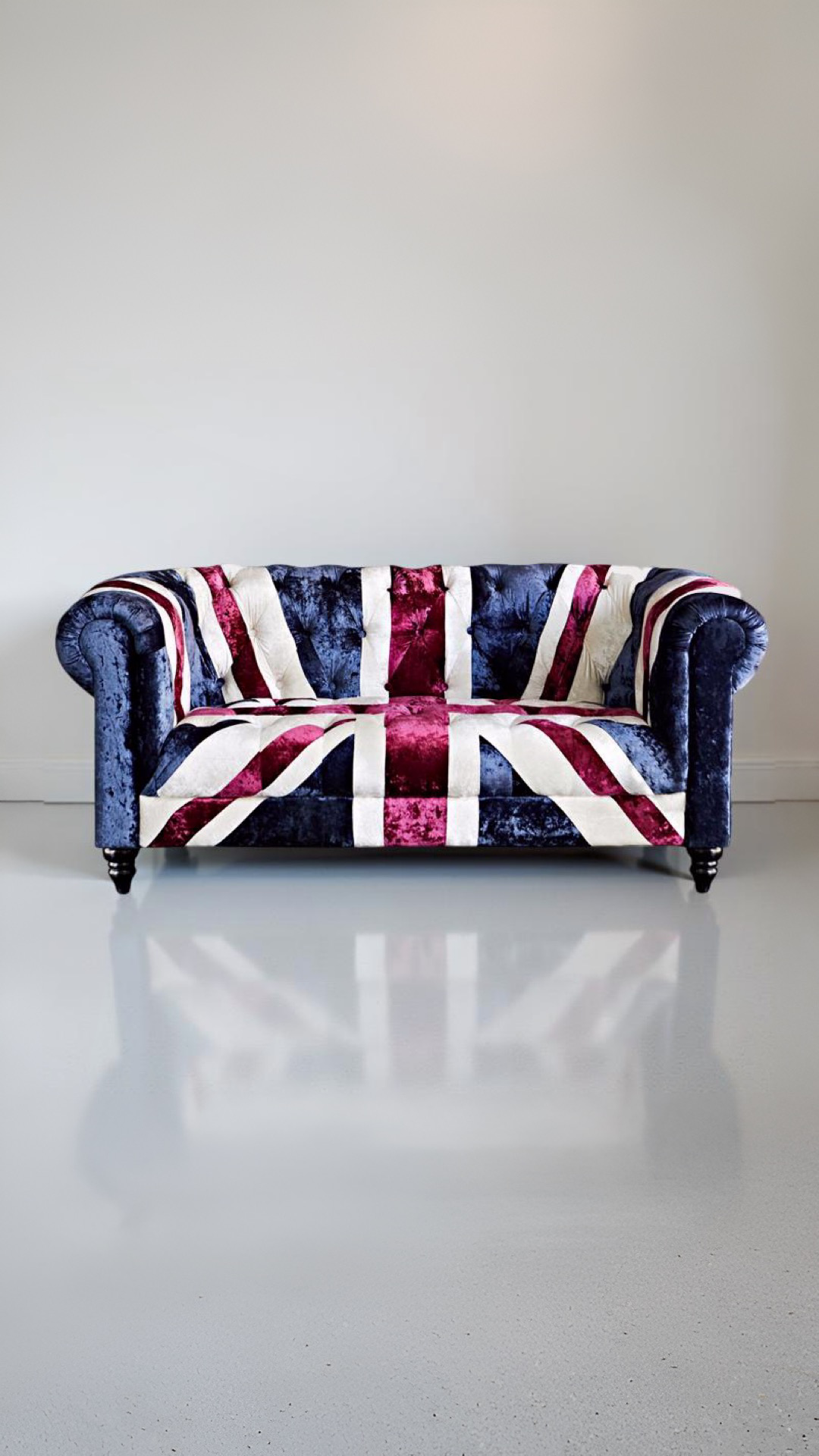 The Harrier 2 Seater sofa is handmade using crushed velvet fabric in the Union Jack design. The opulence and soft-to-the-touch feel of this uniquely vibrant piece will have you wanting to cocoon yourself in its deep-buttoned luxury and enjoy tea and scones all day long.