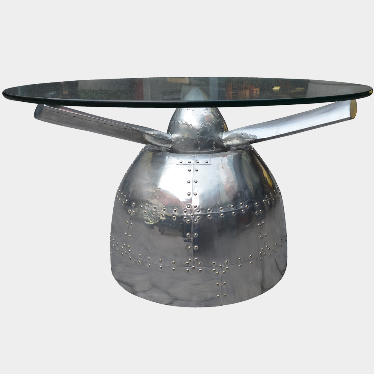 The Avenger coffee table is styled upon a vintage three blade airplane propeller using aluminium with a tempered glass resting on the propeller blades. Uber cool, stylish and functional.