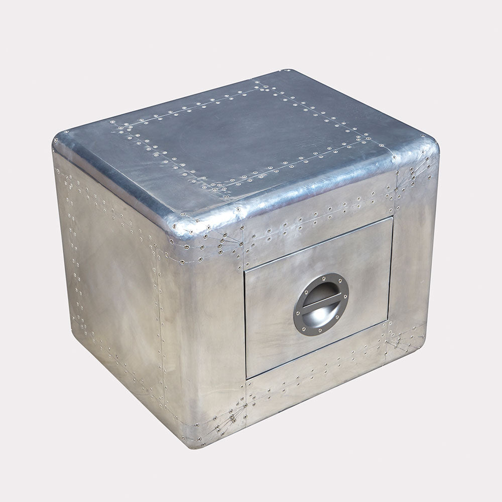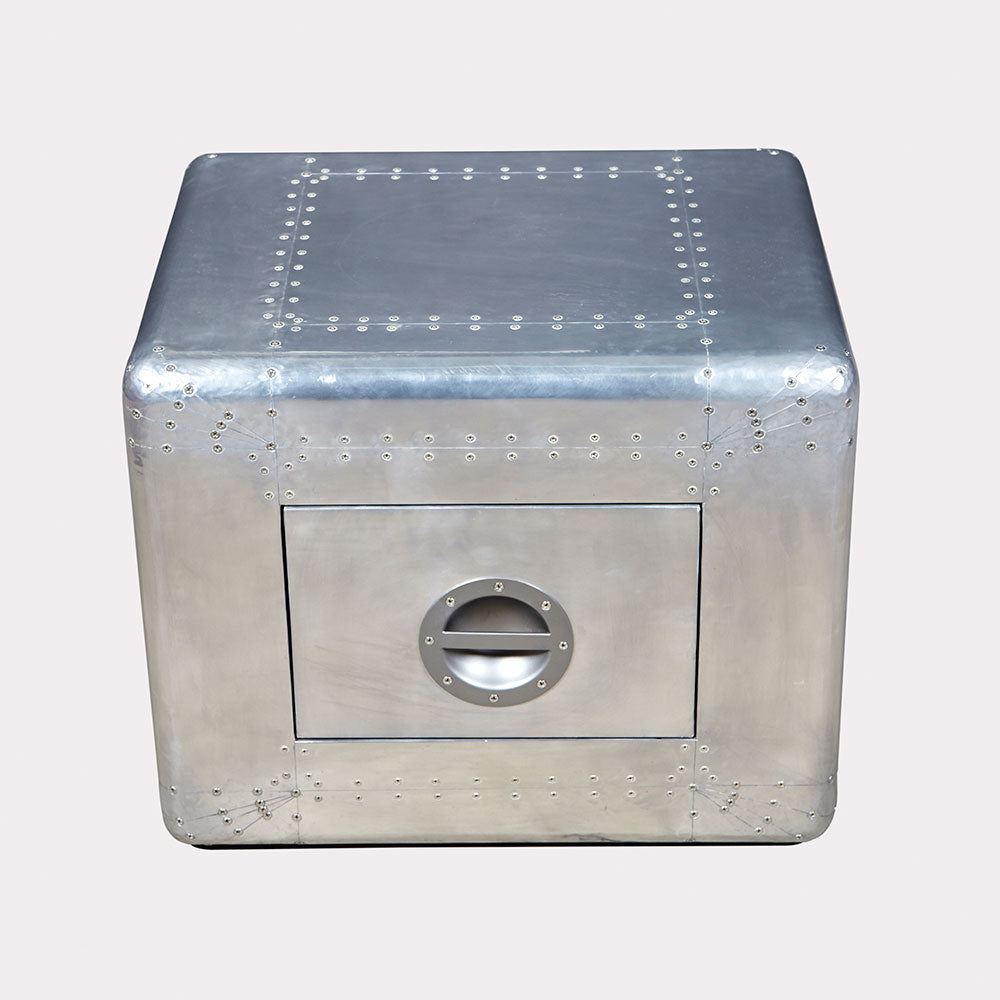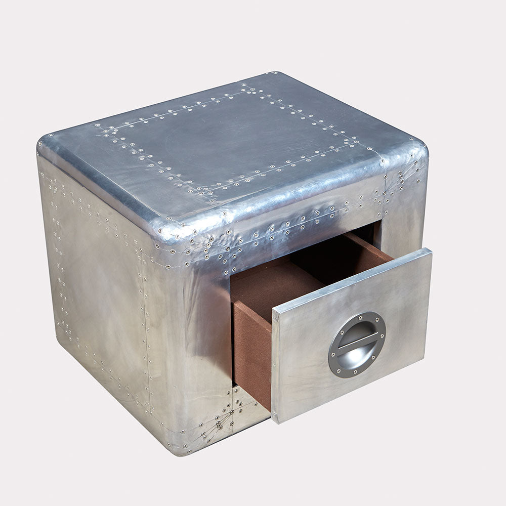 The Dauntless is an Aero-aluminium side table with a soft close drawer that is beautifully crafted with stainless steel screws and a canvas drawer lining