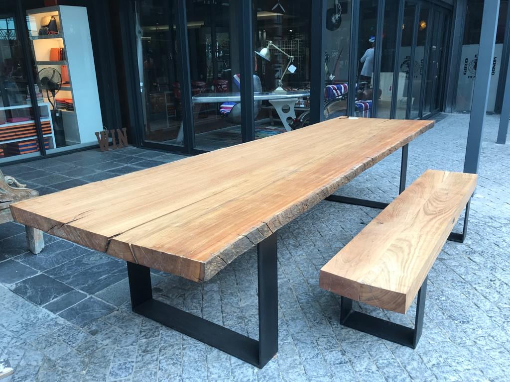 Beautiful thick live edge gumtree table and solid flat bar metal legs. Coupled with a matching bench.