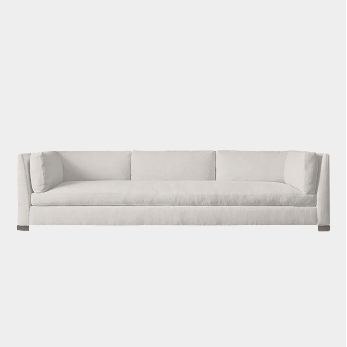 Float off on a luxurious cloud of Belgian linen blend. The Stratford 3 Seater Sofa is upholstered in palest milk tone with extended-length, single section seat cushioning, designed for the ultimate in reclining and comfort. This beauty is low to the floor and rests on discrete hardwood stands.